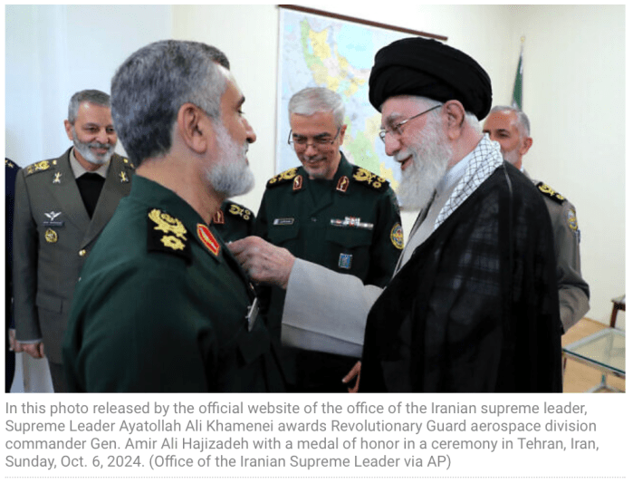 Der ‘Oberste Führer des Irans’ Ali Chamenei hat den Kommandanten der iranischen Luftwaffe, der für den Angriff auf Israel verantwortlich war, hoch dekoriert. Auf seiner Webseite heisst es: «Ayatollah Chamenei überreichte General Amirali Hajizadeh, dem Kommandeur der Luftwaffe der Garde, den Orden des Fath [in Farsi: Mut]. Die Auszeichnung wurde aufgrund der ‚brillanten Operation ‘Ehrliches Versprechen“ verliehen»