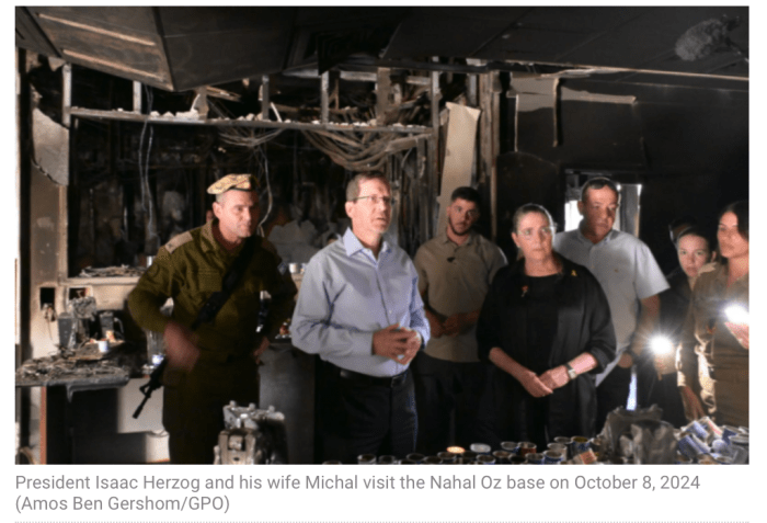 Anlässlich seines zweiten Tages des Besuchs rund um den Gazastreifen, trafen Isaac und Michal Herzog heute in der Militärbasis Nahal Oz ein. Beim Angriff auf diese Station wurden 66 Soldaten getötet. In der ebenfalls auf der Basis stationierten Aufklärungseinheit 8200 wurden 15 Soldatinnen ermordet und sechs nach Gaza verschleppt (s. gestern). Zu den Soldaten sagte Herzog: «An diesem Ort, an dem Israel am 7. Oktober vor einem Jahr einen seiner dramatischsten und schwierigsten Tage durchlebte, gab es während und nach diesem Tag ein schreckliches Massaker. Wir haben viele unserer geliebten Söhne und Töchter in Schlachten verloren, an die wir uns für immer erinnern werden. Ich hoffe sehr, dass die Untersuchung vollständig und umfassend veröffentlicht wird, um Licht in die Geschehnisse zu bringen. Das wird die Realität nicht ändern, aber es ist gut, die Wahrheit zu kennen, damit wir daraus lernen können.» Diese umfassende Untersuchung wird nicht nur vom OGH dringend gefordert. Bisher hat sich Netanyahu allerdings strikt gegen eine solche zu diesem Zeitpunkt ausgesprochen, sie müsse warten, bis der Krieg vorbei sei. Eine durch und durch ungerechtfertigte Haltung, denn bis es so weit ist, dürften einige der Verantwortlichen vorgeben, sich nicht mehr genau erinnern zu können. Das gilt vor allem für ihn selbst!