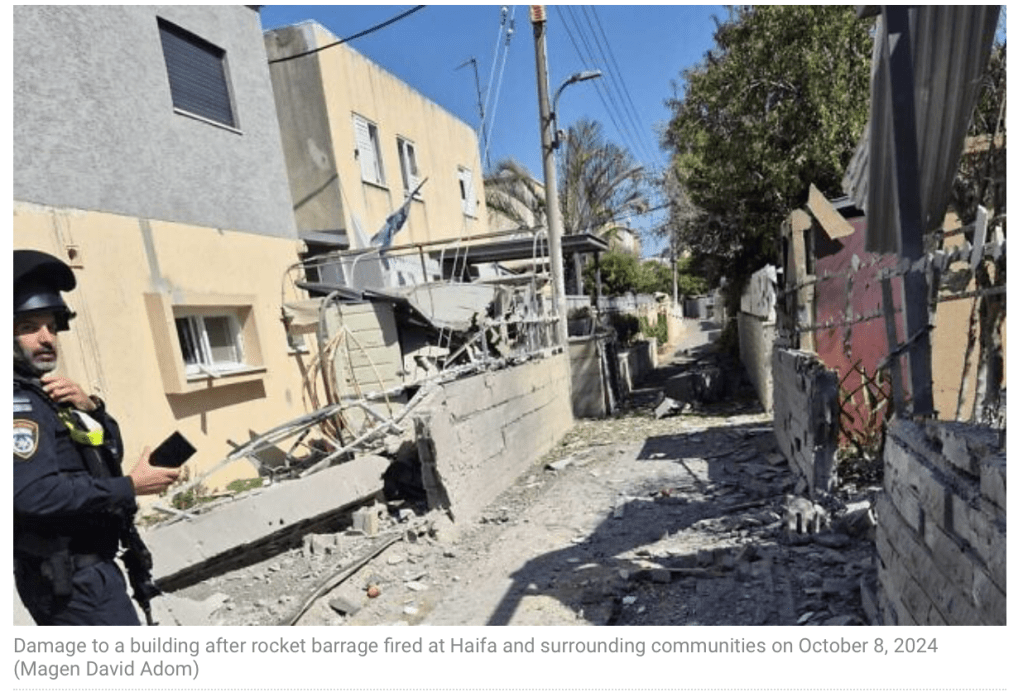 Am Mittag hat sich die Zahl der Raketen aus dem Libanon erneut auf über 100 erhöht, die heute auf Israel abgeschossen wurden. Mindestens 20 davon flogen Richtung Haifa. Die meisten wurden abgefangen. Es gab jedoch auch einige Treffer, die zu Schäden an Häusern führten. Eine Frau wurden durch ein Schrapnell verletzt. Kurz darauf kam eine neue Salve mit über 80 Raketen. Die Raketen konnten überwiegend abgefangen werden. Einige richteten jedoch Schäden in den Vororten Kiryat Yam und Kiryat Motzkin ab. Das ist die bisher grösste Zahl von auf Haifa abgeschossenen Raketen seit Beginn des Krieges. Insgesamt wurden heute elf weitere Personen durch die Angriffe verletzt, sechs, als sie auf dem Weg zum Schutzraum waren. Fünf Personen zeigten Symptome eines schweren Schocks.