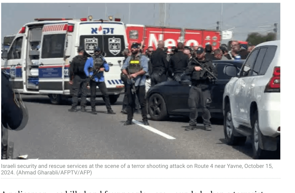 Bei einem Terroranschlag mit einer Schusswaffe auf der Schnellstrasse 4 nördlich von Ashdod wurde ein Polizist erschossen. An einer zweiten Stelle auf der Yavne-Kreuzung schoss der Terrorist ein zweites Mal und verletzte dabei vier Personen. Eines der Opfer war ein Arzt, der zu den Verletzten zu Hilfe eilen wollte, dabei wurde sein Auto von einem nachkommenden Auto gerammt, wobei er verletzt wurde. Der Terrorist wurde von einem bewaffneten Zivilisten neutralisiert.