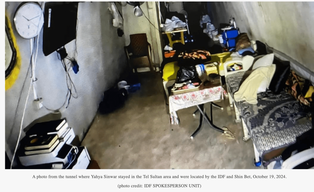 Gemütlich ist anders. Das Zimmer im Tunnel unter der ‘Tel Sultan’ Nachbarschaft, in dem sich Sinwar mit seiner Familie wochen- oder sogar monatelang aufhielt, war mit allem ausgestattet, was der Durchschnittsbürger zum Leben braucht! Die IDF fand ein voll eingerichtetes Badezimmer, eine Küche, Lebensmittel, einen Safe mit unglaublichen Summen von Fremdwährungen, Uniformen. Moderne Flachbildschirme, PCs mit Internetanschluss. Schon einmal, im Februar war ihm die IDF dicht auf den Fersen. «Der Café war noch warm», hiess es damals.
