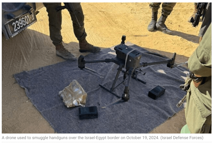 Zumindest dieser Versuch, Waffen nach Gaza zu schmuggeln, ging schief. Israelische Überwachungskameras beobachteten eine Drohne, die von Ägypten aus nach Gaza fliegen wollte, um dort ein Paket abzuliefern. Mit einem gezielten Schuss wurde sie zum Absturz gebracht. In ihrem Paket fand man acht Handfeuerwaffen und Magazine.