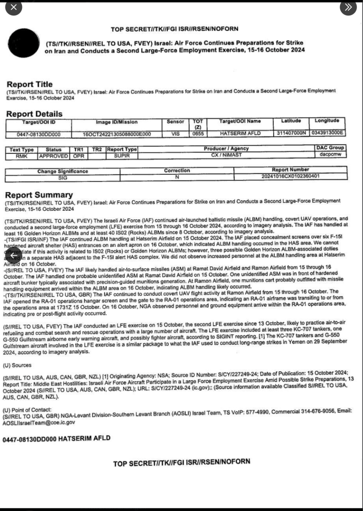 Über die Social-Media-Plattform ‘Telegram’ und deren pro-iranische Unterseite ‘Middle East Spectator’ wurden angebliche US-Geheimdokumente veröffentlicht, die detaillierte Informationen zum geplanten Rückschlag der IDF auf den Iran umfassen. Die zwei Dokumente seien angeblich direkt aus dem Pentagon gekommen. Das US-amerikanische Nachrichtenmagazin Axios erklärte dazu: dass das Leck ein Versuch sein könnte, die israelischen Operationen, die sich der derzeit in der Schlussphase der Vorbereitungen befinden, zu stören. Das Pentagon und der Direktor des Nationalen Nachrichtendienstes lehnten jede Stellungnahme ab, bestritten aber auch nicht deren Echtheit.
