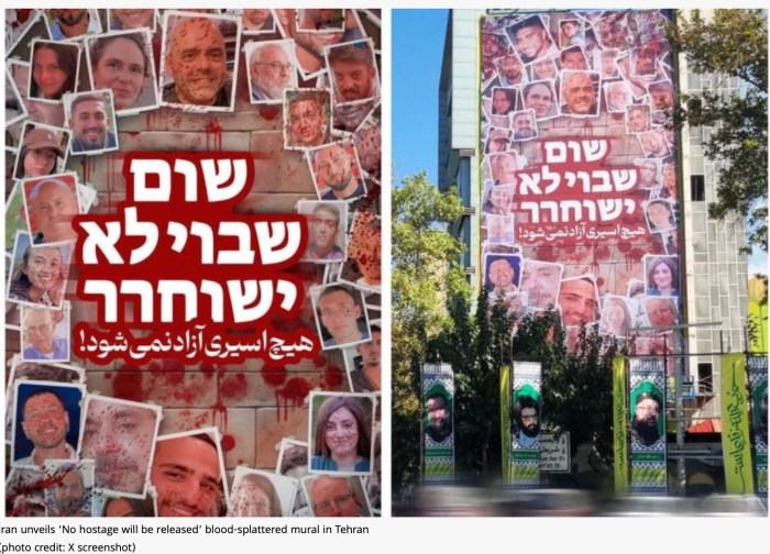 Der Iran veröffentlichte heute das Bild eines Riesenplakates, das in Teheran an einem Hochhaus am ‘Palestine Sq.’ fixiert wurde und auf dem steht «Keine Geisel wird befreit werden!»
