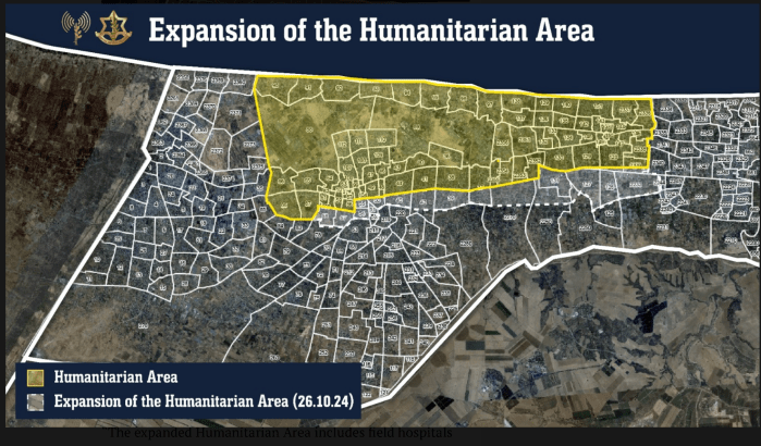 Die IDF erklärte, die ‘humanitäre Schutzzone’ in Gaza auszuweiten, wo sich derzeit die Mehrheit der gazanischen Zivilisten aufhält. «Das erweiterte humanitäre Gebiet umfasst Feldlazarette, die seit Beginn des Krieges eingerichtet wurden, Zeltlager und Schutzausrüstung sowie Lebensmittel, Wasser, Medikamente und medizinische Ausrüstung, die in Abstimmung zwischen COGAT und der internationalen Gemeinschaft nach Gaza gelangt sind», heisst es in einer Erklärung der IDF.
