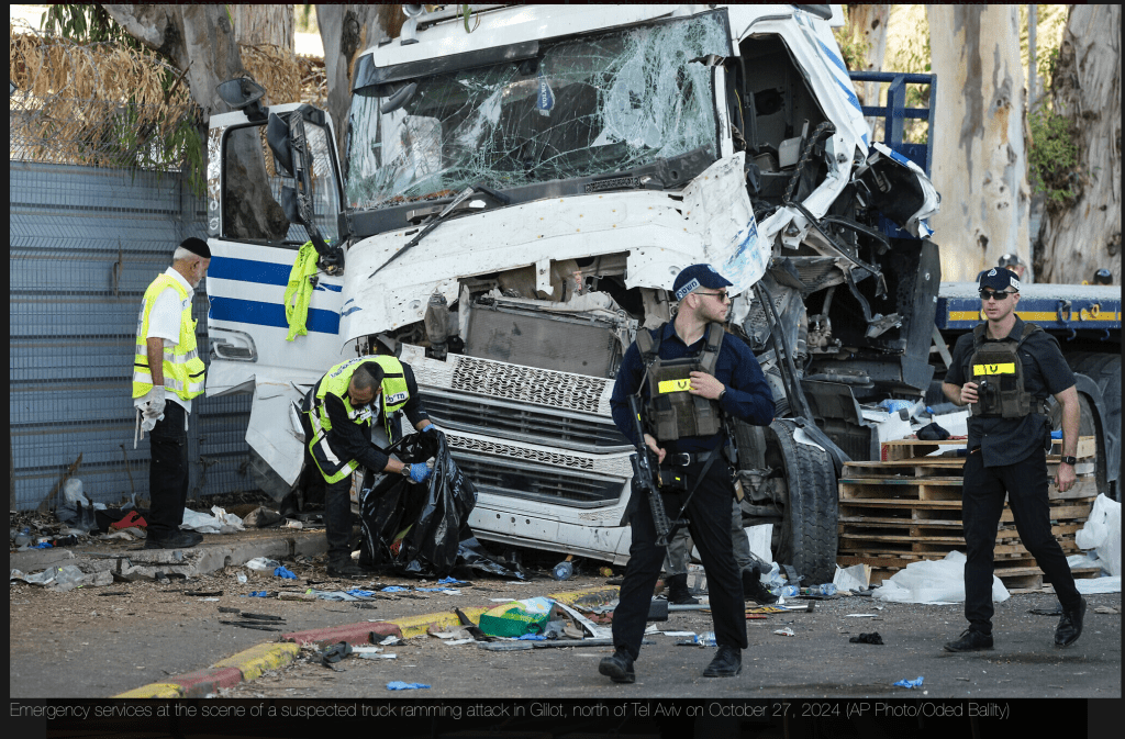 Bei einem Terrorangriff an der Glilot-Kreuzung in der Nähe von Herzliya, bei dem ein LKW-Fahrer sein Fahrzeug in einen an einer Haltestelle stehenden Bus rammte, wurden 32 Personen verletzt. Ein Mann starb noch am Ort des Anschlages. Unter den Verletzten befand sich eine Gruppe von Senioren, die anlässlich des heutigen staatlichen Trauertages ein nahegelegenes Museum besuchen wollten. Acht Passanten, die an der Bushaltestelle standen, wurden unter dem LKW eingeklemmt und mussten von den Ersthelfern zunächst befreit werden. Der Angreifer wurde, entgegen anderslautenden Meldungen, von einem bewaffneten Zivilisten eliminiert. Die palästinensische Terror-Organisation Hamas gab kurz nach dem Anschlag ein Statement ab, in dem sie den ‘heldenhaften Angriff’ in der Nähe des Mossad-Hauptquartiers lobte. Er sei «eine natürliche Reaktion auf die Verbrechen der zionistischen Besatzung gegen unser palästinensisches Volk in Gaza, im Westjordanland und in Jerusalem und die anhaltenden brutalen Massaker, insbesondere im nördlichen Gazastreifen.»