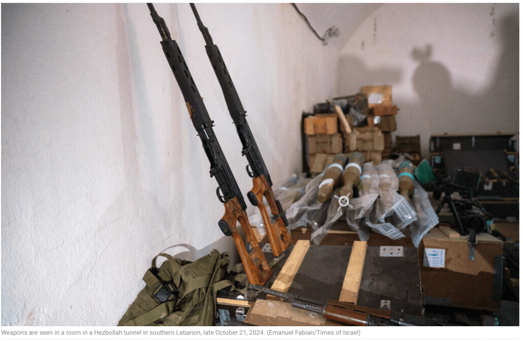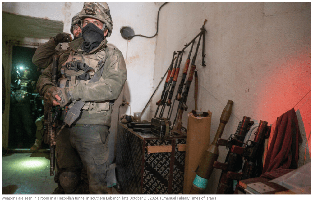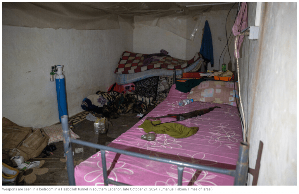 Die IDF spürte vor einigen Tagen unter einem libanesischen Dorf den bisher grössten Bunker auf, der alles enthielt, um für die Invasion des Nordens von Israel vorbereitet zu sein. In der vergangenen Woche konnte schon eine ausgesuchte Gruppe von Journalisten den Bunker gemeinsam mit Soldaten besuchen. Den beeindruckenden Bericht dazu findet ihr hier, bitte nehmt euch die Zeit, den Artikel zu lesen! Der Tunnel ist etwa 2 km lang und befindet sich bis zu 40 m unter der Erde. «Das ist kein Tunnel, sondern eine Festung». Der Bau dürfte Jahre gedauert haben, unter den Augen und Ohren der UNIFIL und der Bevölkerung, wenn nicht sogar mit deren Hilfe. Er bietet Platz genug für Hunderte von Terroristen der Elite-Gruppe Radwan. Vom Hauptgang gehen rechts und links kürzere Gänge ab, die in Räumen enden, die als Wohnbereich, Küchen, Wohn- und Schlafräumen, Sanitäranlagen, sowie Räumen für Generatoren enden. Andere dienen als Waffenlager und Lagerräume für Lebensmittel.