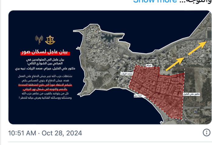 Die IDF forderte gestern Mittag die Bewohner der südlichen Stadtteile von Tyros auf, sich unmittelbar aus dem Wohngebiet bis hinter den Awali-Fluss zu evakuieren. Das Gebiet werde von der IDF zum Kampfgebiet erklärt, ein weiterer Verbleib dort stelle eine Gefahr für die Zivilbevölkerung dar. Kurze Zeit später gab die ‘Nationals News Agency’ bekannt, dass die IAF ein Appartementhaus angegriffen hat.