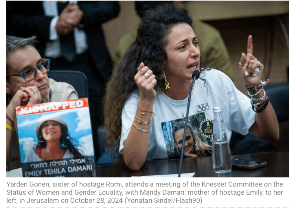 Der ‘Knesset-Ausschuss für die Stellung der Frau und die Gleichstellung der Geschlechter’ unter Vorsitz von MK Pnina Salamon, befasste sich mit der Notlage und dem sexuellen Missbrauch von weiblichen Geiseln in Gaza. Tatsächlich muss nach einer so langen Zeit der Geiselhaft damit gerechnet werden, dass weibliche Geiseln durch die täglichen Vergewaltigungen schwanger wurden und ein Baby bekommen haben. Allerdings muss man in Betracht ziehen, dass wahrscheinlich durch die anhaltende Mangelernährung und den physischen und psychischen Druck der weibliche Zyklus seine Arbeit eingestellt hat und eine Schwangerschaft unwahrscheinlich ist. Yarden Gonen, Schwester von Romi Gonen, 23, die sich immer noch in Geiselhaft befindet, fühlt sich nicht ernstgenommen. «Wenn jemand mit einem Baby zurückkommt, dann komme ich hierher zurück und renne jedem von euch hinterher, denn das hätte vermieden werden können.» Mandi Damari, Mutter von Emily, 26, gibt zu, dass ihre Kraft, zu kämpfen, nachlässt. «Ich weiss jedoch nicht, wie wir noch länger dagegen ankämpfen können. Meine Kraft schwindet sehr schnell, und es ist unglaublich, dass sie immer noch da sind.»