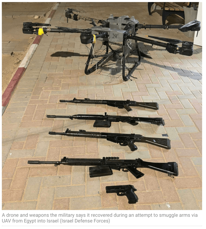 Bereits zum zweiten Mal hat die IDF einen Versuch verhindert, Waffen mittels einer kleinen Drohne von Ägypten in den Gazastreifen zu schmuggeln. Bei den beschlagnahmten Waffen handelt es sich um vier Gewehre und eine Handfeuerwaffe.