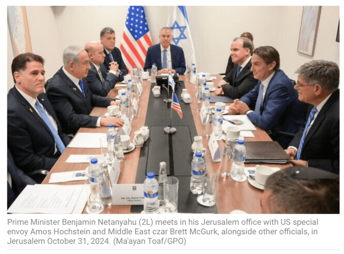 Vorher traf sich Netanyahu in seinem Büro in Jerusalem ebenfalls mit Brett McGurk und Amos Hochstein. Netanyahu betonte, dass das wichtigste Element einer möglichen Vereinbarung mit dem Ziel eines Waffenstillstands zwischen der Hisbollah und Israel nicht «das Papier wert ist, auf dem es geschrieben steht, sondern Israels Entschlossenheit und Fähigkeit, die Vereinbarung durchzusetzen und jede Bedrohung seiner Sicherheit aus dem Libanon abzuwehren, und zwar so, dass alle Bewohner des Nordens sicher zurückkehren können.»