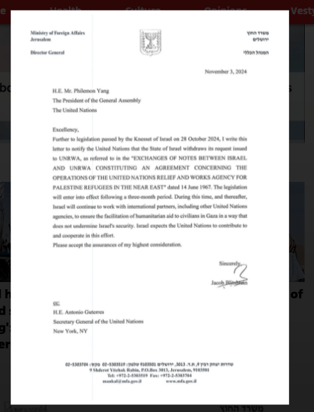 Das Aussenministerium hat die offiziell die UNO darüber informiert, dass es die 1967 abgeschlossene Vereinbarung zur Anerkennung der UNWRA annulliert hat. Damit ist der Handlungsspielraum der UNWRA in Israel, Gaza, sowie Judäa und Samaria stark eingeschränkt. Israel werde mit anderen internationalen Organisationen, auch solchen der UNO, weiterhin zusammenarbeiten. Aussenminister Katz betonte, dass derzeit nur 13 % der Hilfslieferungen durch die UNWRA abgewickelt werden.