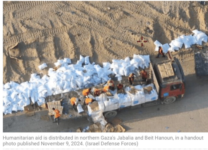 Die IDF informierte darüber, dass eine Lieferung von elf LKWs mit humanitären Hilfsgütern, aber auch Wasser, Lebensmitteln und medizinischen Gütern und Jabaliya und Beit Hanoun ausgeliefert worden sind. Man vermutet, dass derzeit noch einige Tausend Zivilisten in der Gegend leben, obwohl es immer wieder Evakuierungs-Befehle gegeben hat. Seit Anfang Oktober sind über den ehemaligen Personenübergang Eretz etwas 700 LKWs in den Norden des Gazastreifens gefahren.