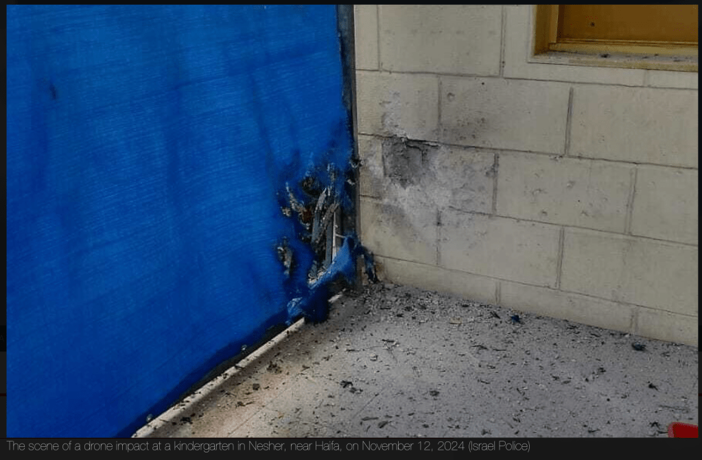 Am frühen Vormittag traf eine aus dem Libanon stammende, mit Sprengstoff beladene Drohne einen Kindergarten in Nesher, einem Vorort von Haifa. Am Gebäude entstand leichter Sachschaden. Die Kinder befanden sich zum Zeitpunkt des Einschlages im Schutzraum. Die IDF untersucht, warum in Nesher kein Alarm ausgelöst wurde, wohl aber in den umliegenden Orten. Es ist ein unglaubliches Glück, dass die Betreuerinnen die weit entfernten Sirenen gehört hatten und den Alarm auf ihren Handis erhielten. Die Kinder wurden nach dem Einschlag in einen anderen Kindergarten gebracht.