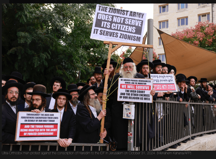 Oppositionsführer Yair Lapid erklärte bei der wöchentlichen Fraktionssitzung: «Die Regierung von Netanyahu ermutigt die haredischen Männer zur ‘Wehrdienstverweigerung und zivilem Aufstand’. Sie unterstützt weiterhin Gesetze, die die Befreiung vom Wehrdienst fördern. Wenn Demonstranten in Bnei Brak und Jerusalem rufen: ‘Wir sterben lieber, als uns zu melden’, während jeden Tag IDF-Soldaten sterben, ist das ein ziviler Aufstand.» Avigdor Lieberman fügt hinzu, dass jeder, der aus religiösen Gründen den Wehrdienst verweigert, den Namen Gottes entweiht. Lieberman kritisiert Rabbi Moshe Hillel Hirsch, den Leiter der Slabodka Yeshiwa in Bnei Brak und einen führenden ultraorthodoxen Rabbiner, dafür, dass er behauptet, Wehrdienstverweigerung sei eine ‘Mitzwa’ (ein Gebot).
