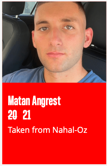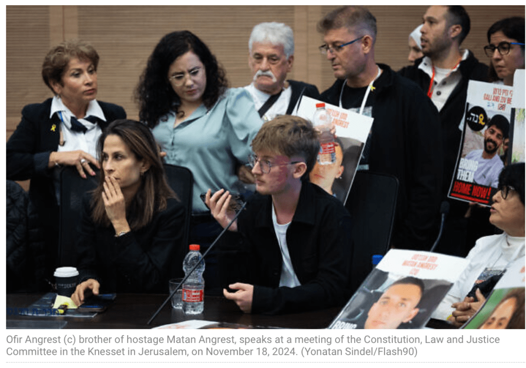 MK Simcha Rothman, Religious Zionism, liess es nicht zu, dass Videos der Geiseln während einer Sitzung des ‘Knesset-Ausschusses für Recht, Justiz und Verfassung’ abgespielt werden, die von der Hamas veröffentlicht worden waren. Es handelt sich um die Familie Trufanov und Angrest. Rothman betonte, das Abspielen von Videos müsse ‘im Vorfeld koordiniert werden’. Ofir Angrest, Bruder von Matan, reagierte aufgebracht: «Wie soll ich das koordinieren, wenn dies die einzige Möglichkeit ist, meinen Bruder zu sehen? Er hat keine Zeit, er braucht Sie, warum kämpfen Sie nicht für ihn? Er ist in den Kampf gezogen, obwohl er wusste, dass er sterben könnte. Die Hamas hat meinen Bruder aus einem Panzer entführt. Wo ist die IDF? Ihr habt meinen Bruder im Stich gelassen.» Matan hatte am 7. Oktober Dienst in Nahal Oz. Auf einem Video, das im Gazastreifen gefunden wurde, sei er, so seine Mutter, mit Blutergüssen zu sehen.