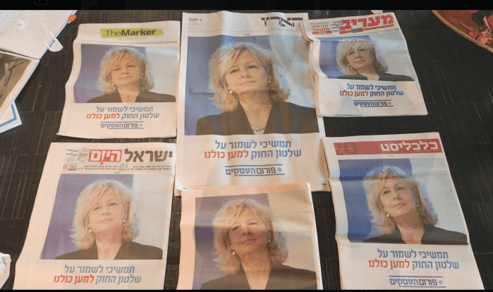 Auf zahlreichen Tageszeitungen erschien heute in den Print-Ausgaben auf der Frontseite ein Bild von GStA Gali Baharav-Miara, jishar koach! Die Seite unterstützt die GStA in ihrer Auseinandersetzung mit der Regierung. Die Anzeigen wurden vom ‘Israel Business Forum’ bezahlt, das die meisten Beschäftigten der 200 grössten Unternehmen im privaten Sektor vertritt. In der Anzeige wird die GStA aufgefordert «weiterhin die Rechtsstaatlichkeit für uns alle zu wahren». Natürlich nahmen Mitglieder der Regierung sofort die Wirtschaftsleute aufs Korn: «Die Tycoons lieben Gali», twitterte Ben-Gvir, «Ich habe Neuigkeiten für das Wirtschaftsforum. Es schützt nicht die Rechtsstaatlichkeit», twitterte der Sprecher der Knesset, Amir Ohana, «Das Gesetz wird von der Autorität der Legislative bestimmt … und wenn die Öffentlichkeit ihre Vertreter ersetzen möchte, sei es, weil sie ihre Gesetzgebung, ihr Handeln, ihr Verhalten oder die Farbe ihrer Augen ablehnt, hat sie das Recht und die Möglichkeit, dies zu tun.» Netanyahu denkt seit Tagen, ja Wochen laut darüber nach, die GStA aus ihrem Amt zu entfernen.