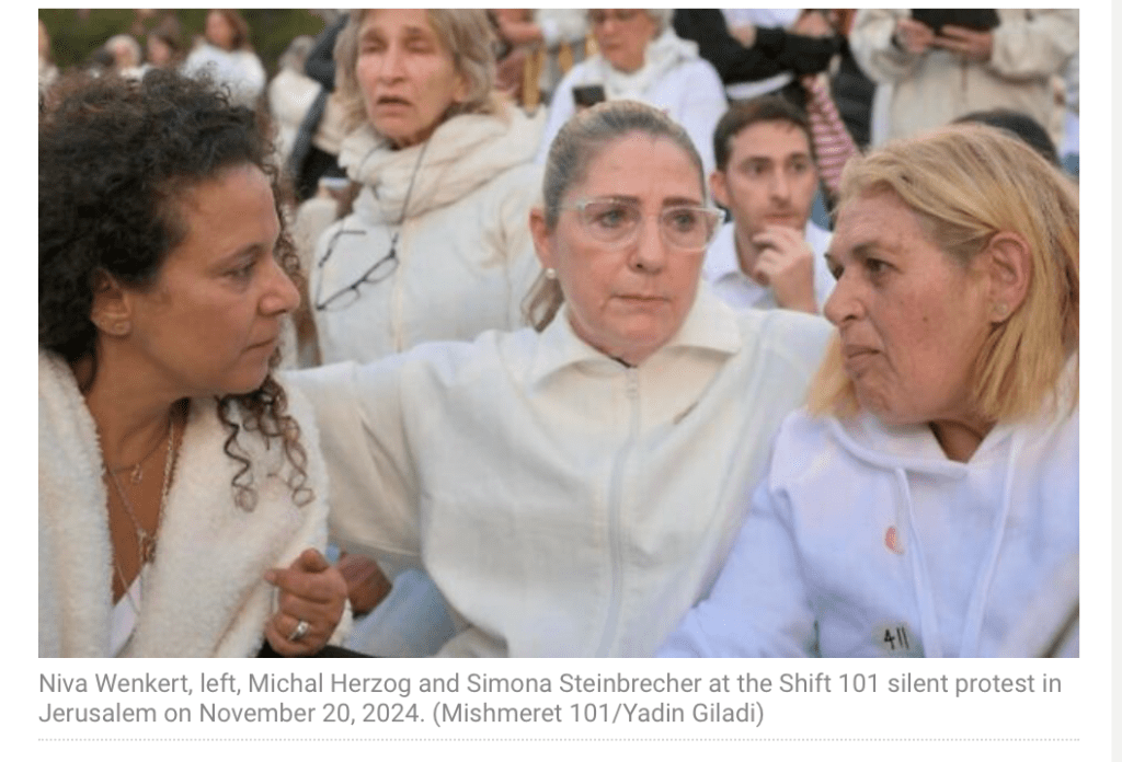 Michal Herzog, die Ehefrau des Präsidenten, nahm an einem stillen Protest von Frauen, überwiegend in Weiss gekleidet, in der Nähe der Villa von Netanyahu in der Gaza Strasse und der Residenz des Präsidenten in Jerusalem teil. Einige Hundert Frauen nahmen zwischen 15:00 und 18:00 an der schweigenden Demonstration teil.