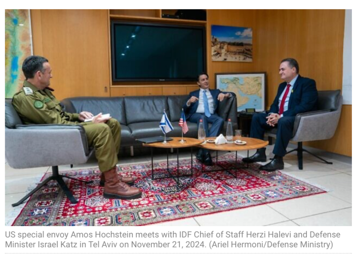 Der US-amerikanische Sonderbeauftragte Amos Hochstein wird sich heute mit Netanyahu treffen. Noch gestern Abend hatte er Gespräche mit dem Minister für strategische Fragen, Ron Dermer, geführt. Es hat auch bereits ein Treffen mit VM Israel Katz und Generalstabscheg Herzi Halevi stattgefunden.