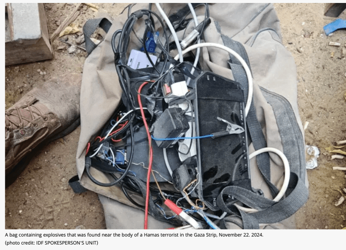 Ein IDF-Video zeigt, wie zwei Hamas-Terroristen bei einem Luftangriff neutralisiert wurden, als sie dabei waren, dicht unter der Oberfläche einer Sand-Strasse in Jabaliya eine Sprengmine zu pflanzen. Mehr als 300 mit Sprengfallen versehene Gebäude wurden von der IDF bisher schon ausgeschaltet.