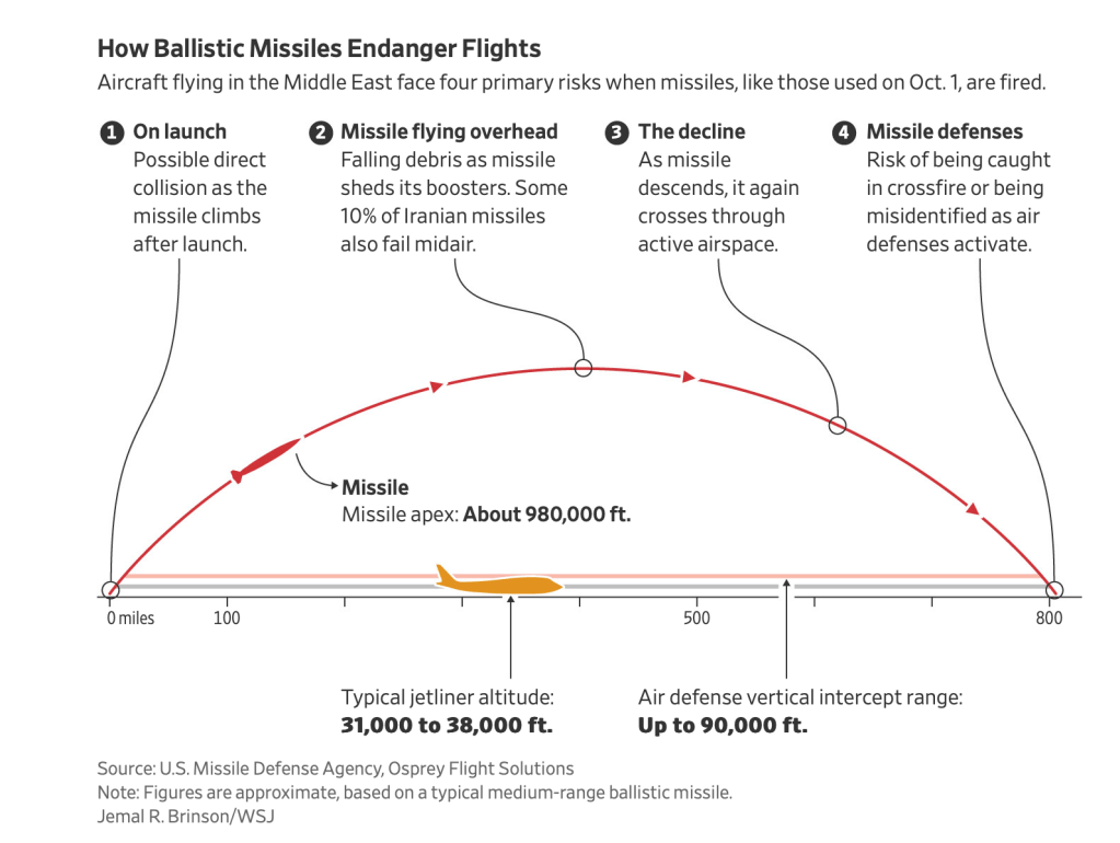 Wie verantwortungslos der Iran während des Angriffs auf Israel am 1. Oktober vorging, zeigen Beobachtungen, Bilder und sogar Videos von Passagieren einiger Linienmaschinen. Während sie bei ihren Flügen den iranischen und irakischen Luftraum durchquerten, stiegen zahlreiche auf Israel abgeschossene Raketen auf. Nur beim Auf- und Absteigen kreuzen die Raketen die Flughöhe der Passagiermaschinen, während ihre reguläre Flughöhe deutlich über der der zivilen Flugzeuge liegt.
