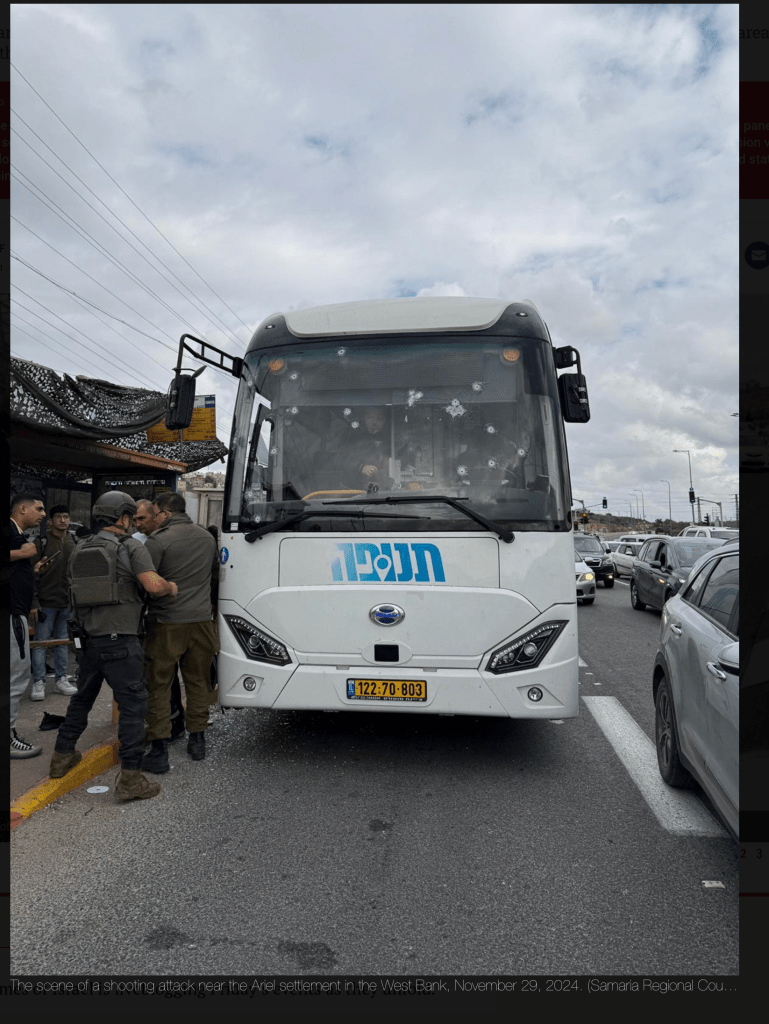 Bei einem Terror-Angriff bei Ariel, Samaria, haben erste Untersuchungen ergeben, dass der Terrorist aus der Gegend von Nablus kommend, eine Hauptstrasse benutzt hat, auf der es keine Check-Points gibt. Er stoppte sein Auto etwa 150 m vor dem Bus an der Haltestelle, lief auf ihn zu und eröffnete das Feuer. IDF-Soldaten, die sich in der Nähe befanden, erschossen ihn nur kurze Zeit später. Die IDF ging zunächst davon aus, dass er kein Einzeltäter war, sondern dass er das M-16 und den Wagen von einem Komplizen erhielt. Die Suche nach einem möglichen zweiten Terroristen wurde nach kurzer Zeit eingestellt, nachdem klar war, dass der Terrorist zumindest am Tatort allein war. Neun Personen wurden verletzt, drei von ihnen schwer, teilte Magen David Adom mit.