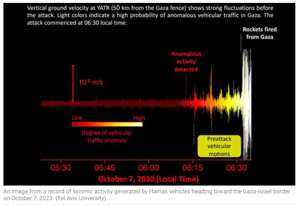 Wissenschaftler der Universität Tel Aviv arbeiten seit fünf Jahren daran, seismische Geräusche, die durch menschliche Geräusche entstehen, zu lokalisieren und zu analysieren. Jetzt haben sie Bilder veröffentlicht, die belegen, dass etwa 30 Minuten vor dem Beginn des Massakers von 3 weit auseinander liegenden Messstationen eine ungewöhnlich starke Fahrzeugbewegung in Richtung der Grenze zu Israel stattfand. Die Aufzeichnungen begannen etwa um 6 Uhr morgens, also 29 Minuten bevor die ersten Terroristen nach Israel eindrangen. Die Ergebnisse der Auswertung wurden in der Zeitschrift ‘The Seismic Record’ veröffentlicht. Die Wissenschaftler glauben, dass die Entdeckung den potenziellen Einsatz seismischer Sensortechnologie zur frühzeitigen Warnung vor terroristischen Aktivitäten demonstriert, betonen jedoch, dass ihre Untersuchungen Monate nach dem Massaker stattfanden. «Am Morgen des Angriffs, als die Aktivitäten in der Nähe der Stationen minimal waren, fanden wir einzigartige, weit verbreitete seismische Ausschläge, die monoton zunahmen, je näher der Zeitpunkt des Angriffs rückte. Keine bekannte natürliche oder menschliche Quelle auf israelischer Seite hätte seismische Signale mit einer Verteilung und Intensität erzeugen können, die denen der Hamas-Bewegungen ähneln.»