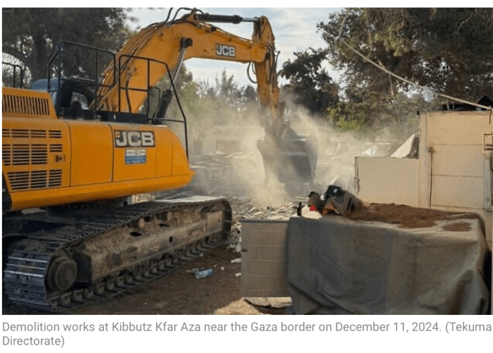 Im Kibbutz Kfar Aza haben die Abbruch- und Aufräumarbeiten nach dem Massaker vom 7. Oktober begonnen. 97 Häuser werden abgerissen, dazu kommen möglicherweise noch weitere Gebäude aus dem ‘Jugend-Gebiet’, das 48 Gebäude umfasst. 400 Gebäude können renoviert werden. Etwa US$ 56 Millionen werden für den Wiederaufbau bereitgestellt.
