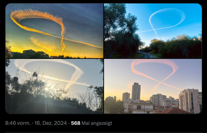 Ach herrjeh, was hat denn die IAF für Sorgen! Heute in den frühen Morgenstunden tauchten an mehreren Stellen am Himmel über Israel Kondensstreifen, die eindeutig die (gelben) Schleifen darstellen, die für ‘Bringt die Geiseln nach Hause’ stehen. Sie seien, so die IAF, nur dort entstanden, wo Kampfjets unterwegs waren. Und es hätte keine Koordination der Piloten mit der IAF gegeben. Niemand hat die Verantwortung übernommen, aber man untersuche, ob es sich auch um ein ganz natürlich entstandenes Phänomen handelt. Gott behüte, da kann sich doch wohl niemand einfach getraut haben, diese symbolträchtigen Bänder an den Himmel zu zeichnen?