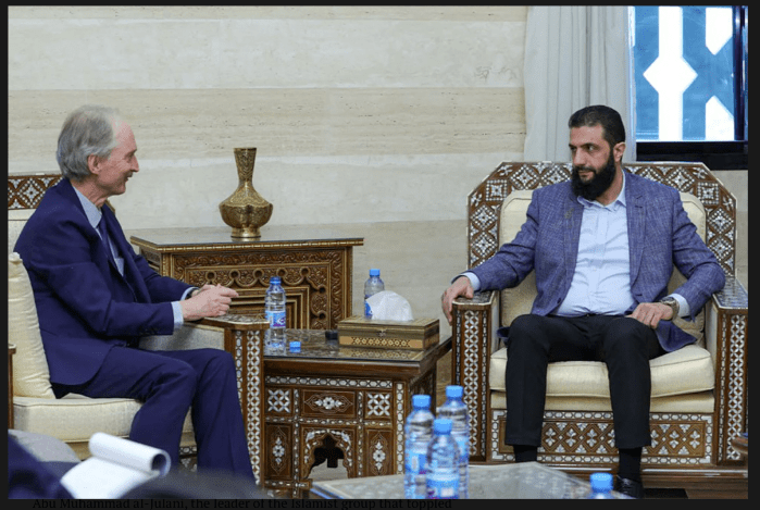 Bei einem Treffen zwischen dem HTS-Führer Abu Muhammad al-Julani und dem EU-Sondergesandten für Syrien, Gier Pedersen, in Damaskus, betonte Julani: «Wir wollen keinen Konflikt, weder mit Israel noch mit irgendjemand anderem, und wir werden nicht zulassen, dass Syrien als Ausgangspunkt für Angriffe genutzt wird. Das syrische Volk braucht eine Pause, und die Angriffe müssen aufhören, und Israel muss sich auf seine vorherigen Positionen zurückziehen.» Er gab auch an, dass die Rebellengruppen aufgelöst und dem Verteidigungsministerium unterstellt werden. «Alle werden dem Gesetz unterworfen sein.» Gleichzeitig forderte er die Aufhebung bestehender gegen Syrien gerichteter Sanktionen, damit die Flüchtlinge des Assad-Regimes ungehindert zurückkommen können. Die neue Regierung werde auch die bestehende Verfassung überarbeiten, aber, so betonte er, das brauche Zeit, ebenso wie die Vorbereitung von Wahlen.