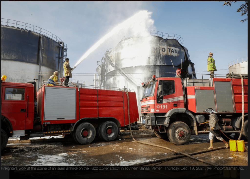 Lange genug haben wir gewartet. Nun hat die IDF im Jemen zurückgeschlagen. In den frühen Morgenstunden führte die IAF eine Reihe von intensiven Luftangriffen durch. Betroffen war die von den Houthi-Terroristen besetzte Hauptstadt, Sana’a, sowie die Region Hodeida. Wie bereits bei den beiden ersten Angriffen der IAF auf Hodeida, waren wiederum vierzehn Kampf- sowie Tankflugzeuge und Spionage-Flugzeuge an der Operation beteiligt. Beide Orte liegen etwa 2.000 km von Israel entfernt. Der Angriff wurde während der letzten Wochen geplant. Das Ziel war es, die drei an der Küste des Landes gelegenen Häfen ausser Gefecht zu setzen. Acht Schleppschiffe, die die Frachtschiffe in die Häfen ziehen, sowie ein Kraftwerk und Lastenkräne und ein Oel-Tank wurden zerstört. Damit wird es bis auf Weiteres keine im Zusammenhang mit den Häfen stehende Aktivität der Houthis mehr geben. Bei den Angriffen sollen, so ein Kommunikationsmedium der Houthis, neun Menschen getötet worden sein. Der Sprecher der israelischen Streitkräfte, Daniel Hagari, bestätigte, dass zu den Zielen, die bei den ‘Präzisionsschlägen’ getroffen wurden, ‘Häfen und Energieinfrastruktur’ gehörten, die die Houthis seiner Meinung nach für ‘ihre militärischen Aktionen’ nutzen. Der Iran verurteilt den Angriff Israels als grobe Verletzung des ‘Internationalen Rechts’. Seltsam, sind die Terror-Angriffe vom Iran ein internationales Recht der Ajatollahs?