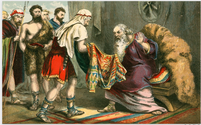 Die Brüder kehrten nach Hause zurück in scheinbarer Trauer um den getöteten Bruder. Um den Vater zu täuschen, hatten Josefs Brüder sein Obergewand bei sich behalten, tränkten es im Blut eines Ziegenbocks und legten diesen dem Vater vor, als Beleg für die traurige Nachricht, dass er von einem wilden Tier zu Tode gebissen worden war.