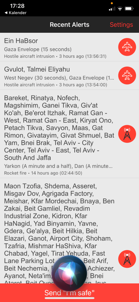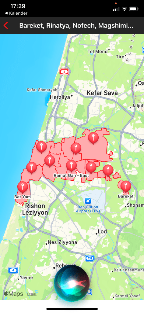 Yuval Harpaz hat alle relevanten Daten gesammelt. Zwischen dem 7. Oktober 23 und dem 30. November 24 wurde in 40.000 Fällen der Alarm ausgelöst. Nicht, weil tatsächlich so viele Raketen oder Drohnen auf uns abgeschossen wurden, sondern weil der Alarm zumeist grossräumig ausgelöst wird. Die nachfolgenden Screenshots von meinem Handy zeigen einen Teil der angenommenen Gefährdung durch die Rakete aus dem Jemen von heute Nacht.