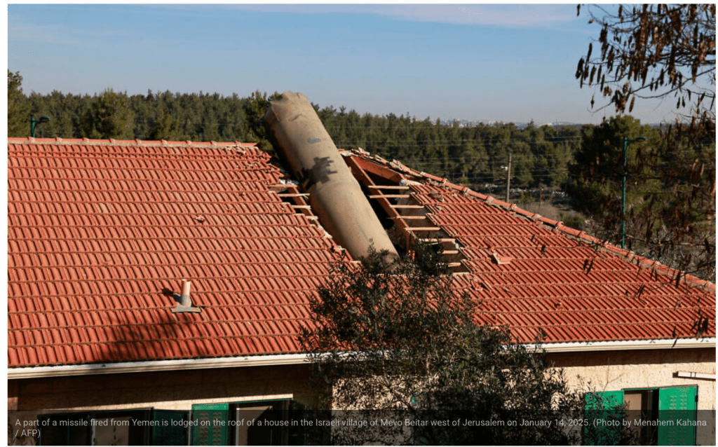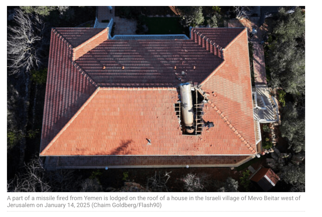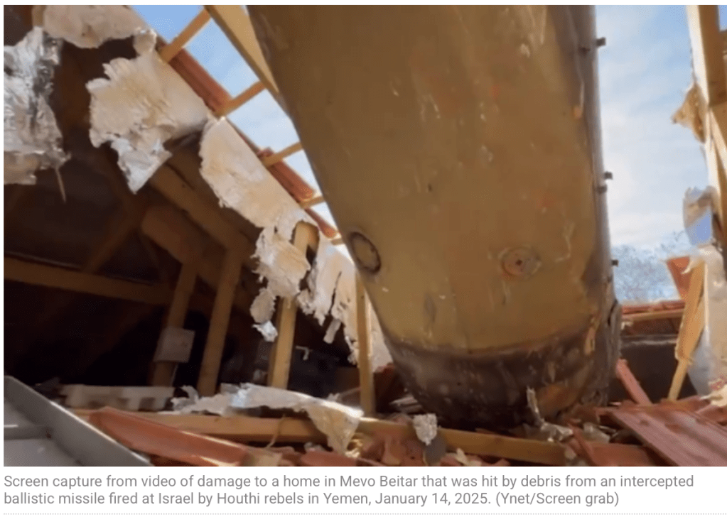 Ein Ehepaar in Mevo Beitar, nur zehn Kilometer von Jerusalem entfernt, kam von einem Morgenspaziergang nach Hause und musste erkennen, dass ein grosses Trümmerteil einer Rakete ihr Hausdach zerstört hatte. Es stellte sich als Trümmerteil einer von den Houthi-Terroristen auf Israel abgeschossenen Rakete heraus, die von der IDF abgefangen und zerstört wurde. Als in der Nacht der Alarm ausgelöst wurde, suchten sie sofort ihren Schutzraum auf. Die Geräusche, die sie hörten, empfanden sie mittlerweile als normal. Sie sind seit Wochen in der Nacht zu hören, wenn die IDF die Raketen der Houthi-Terroristen abfängt. Als sie am Morgen das Haus verliessen, fanden sie kleine Trümmerstücke im Garten. Den vollen Umfang des Schadens realisierten sie erst, als sie sich dem Haus wieder näherten. Ein vier Meter langer Trümmerteil hatte das Dach durchschlagen und war auf dem darunterliegenden Schutzraum ‘gelandet’. Wäre der Aufschlag auf dem Dach an einer anderen Stelle geschehen, wäre der Schaden sicher noch viel grösser gewesen. Das Haus wird jetzt von Fachleuten untersucht, um festzustellen, ob es noch bewohnbar ist.