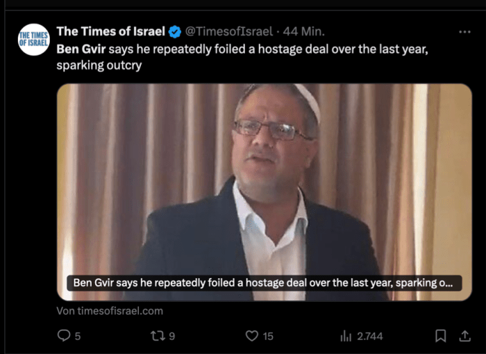 Am Mittag löste der rechts-extreme Ben-Gvir einen empörten Aufschrei aus, als er in einem Video auf X zugab, im vergangenen Jahr mehrmals einen Deal verhindert hat. In anderen Staaten wäre dieses Bekenntnis ein Grund, ihn aus der Regierung und aus der Knesset zu verbannen. «Im letzten Jahr ist es uns gelungen, dieses Abkommen immer wieder zu verhindern, indem wir unsere politische Macht eingesetzt haben», schreibt er. Jetzt hat sich die Situation in der Regierung geändert. Seit der Aufnahme von Gideon Sa’ar mit seinen vier Mitläufern in die Regierung hat sich das Machtgefüge verschoben (s. mein Bericht von gestern). «In letzter Zeit sind weitere Akteure, die das Abkommen unterstützen, der Regierung beigetreten, und wir haben nicht mehr das Gleichgewicht der Kräfte in der Hand», klagt er.