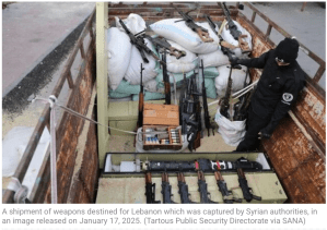 Syrien hat erfolgreich einen Waffenschmuggel auf dem Meerweg in den Libanon verhindern können. In der ‘Lieferung’ befanden sich Gewehre, Granat-Werfer, Drohnen und andere Waffen.