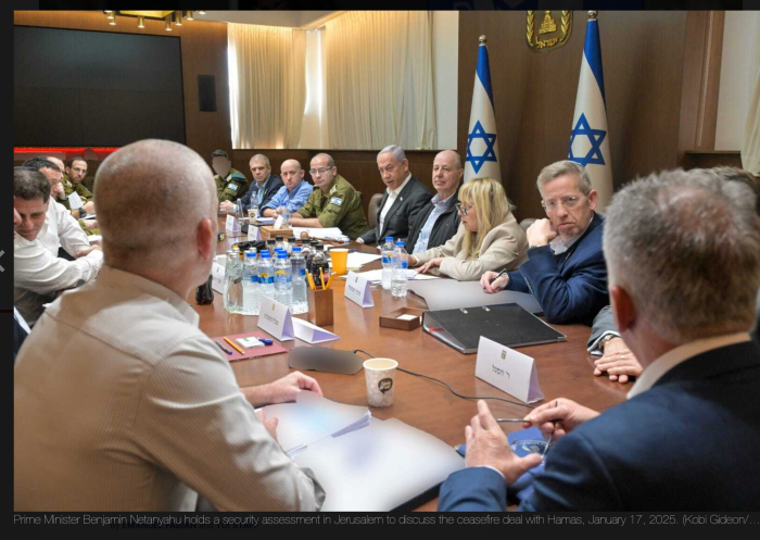 Derzeit ist wohl die alles beherrschende Information des heutigen Tages, dass sich das Nationale Sicherheitskabinett zu Beratungen über den bevorstehenden Abschluss des Abkommens trifft. Anders als geplant trifft sich die gesamte Regierung um 15:30 Ortszeit, eine knappe Stunde vor Shabbateingang, um über das Abkommen abzustimmen. Das Abkommen wurde gestern am späten Abend in Doha unterzeichnet und wird am Sonntag um 12:15 in Kraft treten. Das Verhandlungsteam war kurz vor der Sitzung aus Doha zurückgekommen. Das Sicherheitskabinett gab, wie erwartet, seine Zustimmung zum Abkommen.