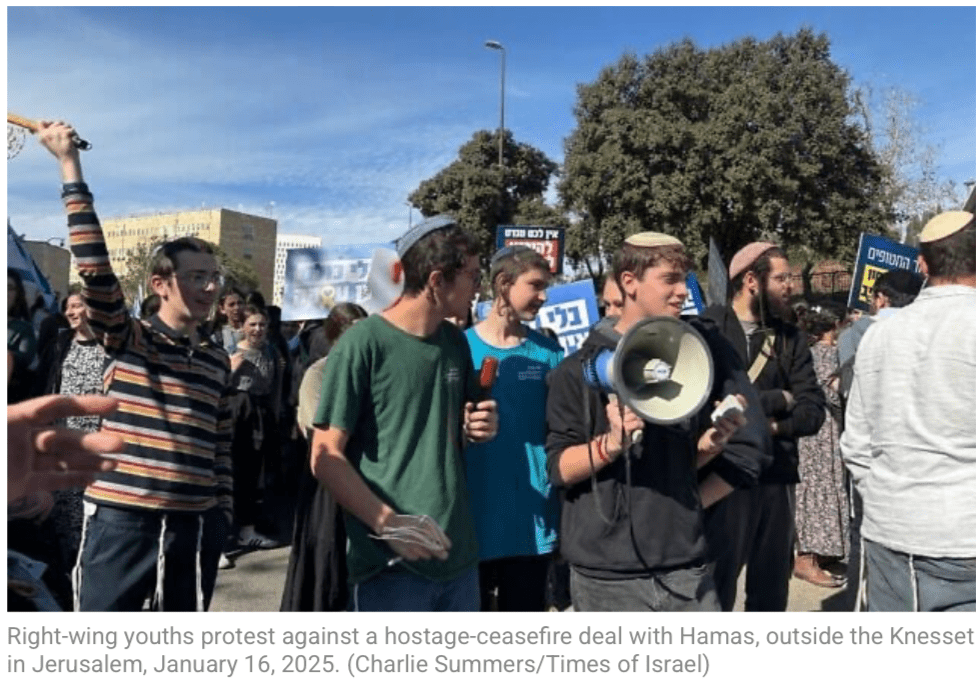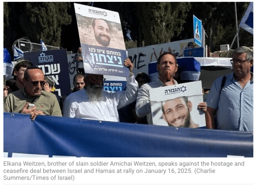 Kurz vor 13 Uhr treffen einige Hundert rechtsgerichtete Demonstranten vor der Knesset ein. Familienangehörige von gefallenen Soldaten und noch in Gaza festgehaltenen Geiseln erklären, dass das Abkommen eine Kapitulation vor den ‘Arabern’ darstellt. «Das Ziel dieser Araber – der Hamas und aller anderen – ist es, die Ehre Israels zu beschmutzen.» und «Bibi, wach auf, jüdisches Blut ist nicht billig!» skandieren die zumeist orthodoxen jugendlichen Demonstranten. Zvika Mor, der Vater der Geisel Eitan Mor, 24 und einer der Gründer des Falken-Forums Tikva, er habe heute Morgen darum gebeten, auf einer Versammlung der Fraktion des religiösen Zionismus sprechen zu dürfen, sei aber abgewiesen worden. «Lösen Sie [Smotrich] die Regierung auf, Sie dürfen diesen Deal nicht genehmigen lassen», sagt Mor in einer Videobotschaft. «Durch diesen Deal wird mein Sohn noch viele Jahre in Gaza zurückbleiben – darauf bin ich nicht vorbereitet.» Gleichzeitig findet eine Gegendemonstration des rechten ‘Helden-Forums’ statt. Hunderte von ihnen trafen sich vor dem Büro des PM und beklagten ebenfalls, dass das Abkommen eine Kapitulation vor der Hamas darstellt, die der ‘Würde des jüdischen Volkes’ schadet.