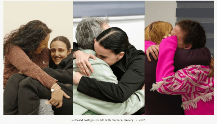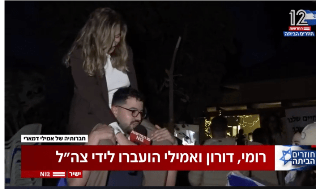 - Die Mütter von Romi Gonen, Emily Damari, and Doron Steinbrecher verfolgen gemeinsam mit Generalmajor Dado Bar Kalifa die Rückkehr ihrer Töchter, die sie in wenigen Minuten nach 471 Tagen erstmals wieder in die Arme schliessen dürfen