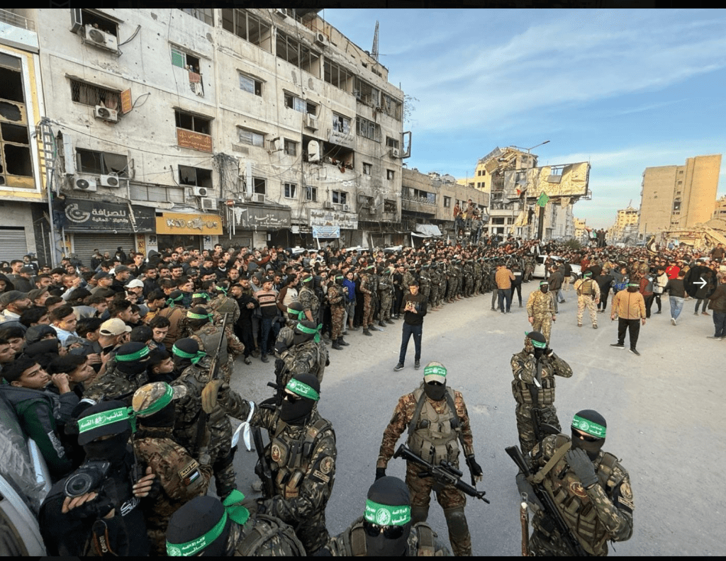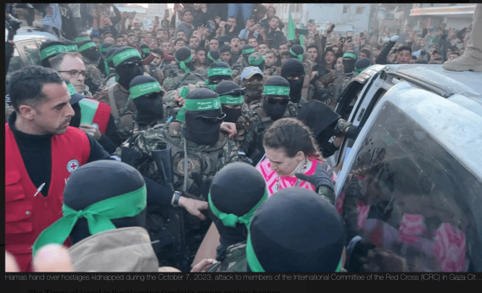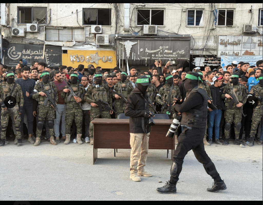 - Auf dem Al-Saraya-Platz in Gaza City spielen sich die für die Hamas typischen Szenen ab. Tausende Palästinenser, darunter eine grosse Zahl von Terroristen, belagern die Fahrzeuge, mit denen die Geiseln gebracht werden, stehen auf dem Autodach, reissen die Türen auf….