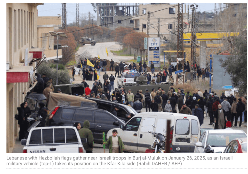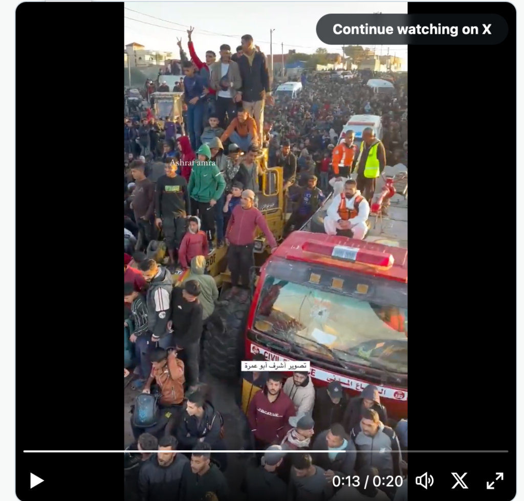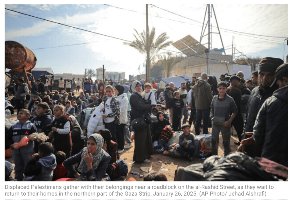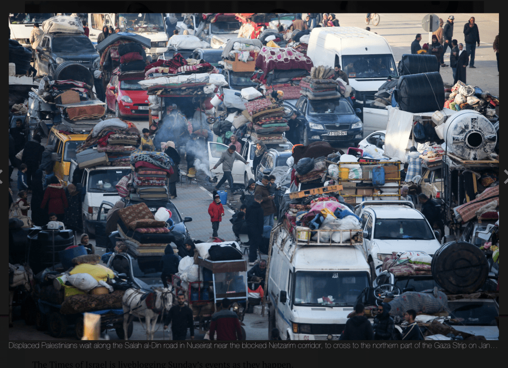 Nachdem die Süd-Nord-Querung des Netzarim-Korridors derzeit gesperrt ist, stauen sich mehrere Tausend Gazaner auf der Küstenstrasse al-Rashid in der Höhe des Nuseirat Flüchtlingscamps. Bis heute sollte sich die IDF aus dem westlichsten Teil des Netzarim-Korridors zurückziehen und den Weg für die Binnen-Vertriebenen freimachen. Israel hat den Rückzug gestoppt, nachdem die Hamas eine Zivilistin, die freigelassen werden sollte, nicht freiliess und auch bisher nicht den nachvollziehbaren Beweis erbrachte, dass sie noch lebt. Einen zweiten Bruch des Abkommens sieht Israel darin, dass bisher noch keine Liste vorgelegt wurde, wer von den verbliebenen 27 noch freizulassenden Geiseln der erste Runde noch lebt. Mediationsversuche in Kairo, die die Hamas zur Einhaltung der Bedingungen bringen wollten, verliefen ohne Erfolg. Im Gegenteil, die Hamas beschuldigte Israel, das Abkommen zu brechen, indem sie die Möglichkeit der Rückkehr in den Norden verweigert.