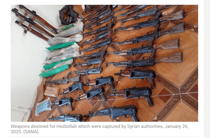 Syrische Sicherheitsgruppen konnten eine Waffenlieferung abfangen, die für die Hisbollah im Libanon bestimmt waren. Die benutzte Schmuggelroute verläuft entlang der syrisch-libanesischen Grenze in der Höhe der Stadt Sarghaya. Es ist dies die zweite ‘Lieferung’ innerhalb einer Woche, die von Syrien vereitelt wurde.