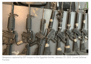 Der IDF gelang es, einen Waffenschmuggel mittels einer Drohne von Ägypten nach Israel zu verhindern. Die Drohne wurde von der IDF über israelischem Gebiet abgeschossen. Sie trug 13 Sturmgewehre. Es war nicht der erste Versuch, Waffen mit Drohnen nach Israel zu schmuggeln. Bisher konnten alle abgefangen werden.