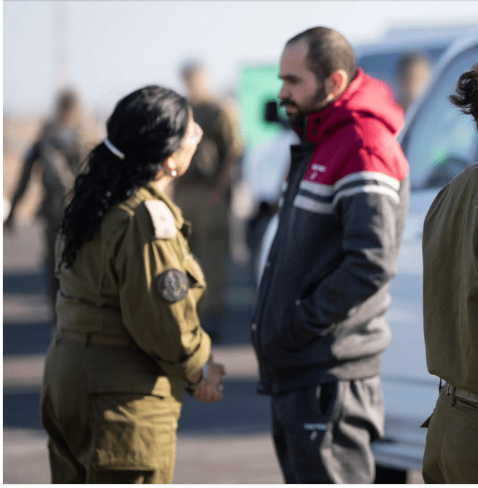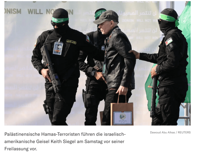 Yarden Bibas, 35, Keith Siegel, 65, und Ofer Calderon, 54, sind am frühen Vormittag sicher in Israel angekommen. Bibas und Calderon wurden in Khan Younis bei der schon bekannten, zynisch orchestrierten Verabschiedung vorgeführt, um anschliessend dem IRK und dann der IDF übergeben zu werden. Siegels ‘Verabschiedung’ fand am ‘Hafen von Gaza’ statt. Auf übergrossen Plakaten stand dreisprachig zu lesen «Der Zionismus wird nicht siegen». Die freigelassenen Geiseln erhielten wieder die bereits obligatorischen Papierbeutel, Siegel erhielt einen zweiten Beutel, der für seine Frau Aviva gedacht war, die im November freigelassen wurde.