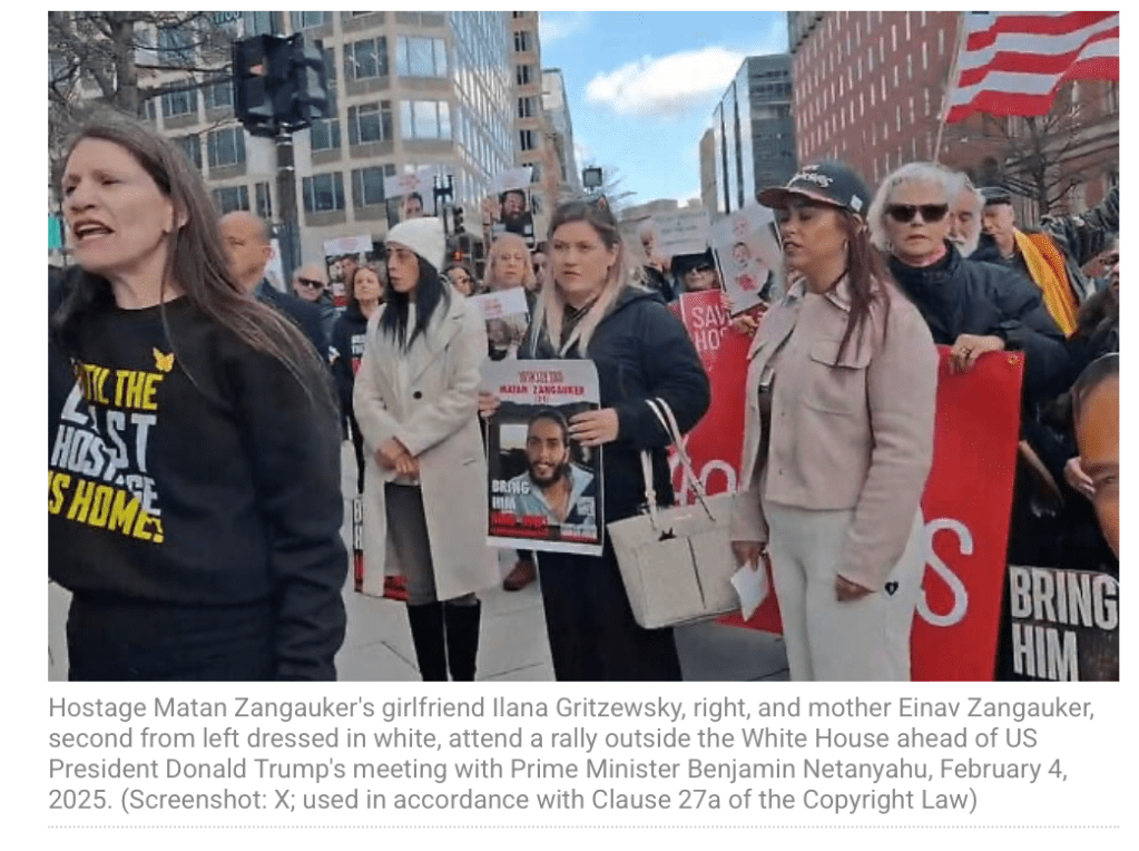 Am Dienstagnachmittag demonstrierten Dutzende Familienangehörige vor dem Weissen Haus in Washington. Darunter Einav Zangauker, die seit Monaten unermüdlich für die Freilassung der Geiseln, darunter auch ihr Sohn Matan, kämpft. Begleitet wurde sie von Ilana Gritzewsky, der Freundin ihres Sohnes, die im November 2023 freigelassen wurde. «Sehr geehrter Präsident Trump, ich möchte Ihnen persönlich für Ihr Engagement für die Befreiung unserer Geiseln und die Beendigung des Krieges danken», sagt Zangauker in ein Megafon. «Wir sind hier, um Sie zu bitten, Druck auf die israelische Regierung auszuüben. Wir hören die Stimmen der extremistischen Partner in Netanyahus Regierung, die das Abkommen sabotieren und am Ende der ersten Phase des Abkommens zu den Kämpfen zurückkehren wollen – was für meinen Matan und die anderen Geiseln, die in Gefangenschaft zurückbleiben, einem Todesurteil gleichkommt.