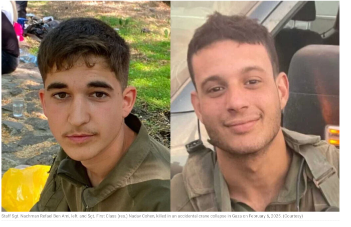 Leider musste die IDF erneut den Tod von zwei Soldaten bekannt geben. Staff Sgt. Nachman Rafael Ben Ami, 20, und Sgt. First Class (res.) Nadav Cohen, 21, s’’l, wurden Opfer eines tragischen Unfalls. Ein von der IDF genutzter Kran stürzte zusammen und fiel auf ein Zelt, in dem die Soldaten schliefen. Acht weitere Soldaten wurden verletzt. Auf dem Kran war eine Plattform mit Überwachungsausrüstung und Antennen installiert, die von der IDF während des Krieges zur mobilen Überwachung eingesetzt wurden.