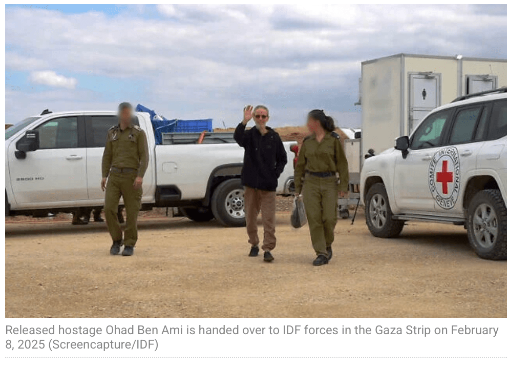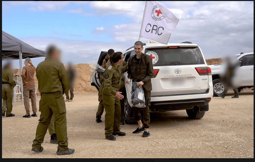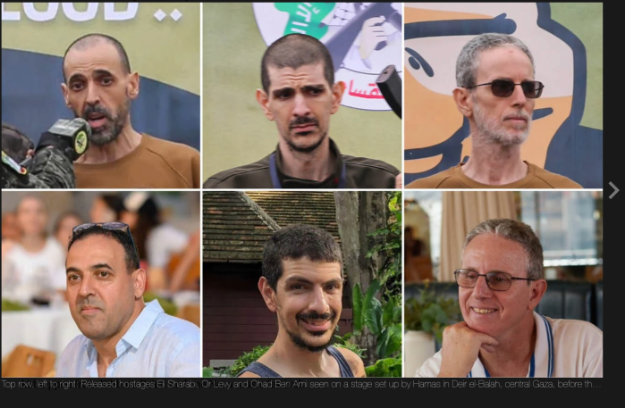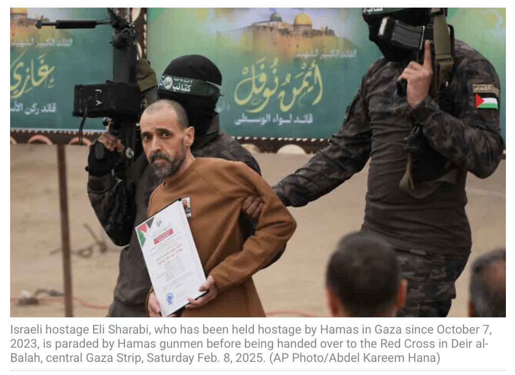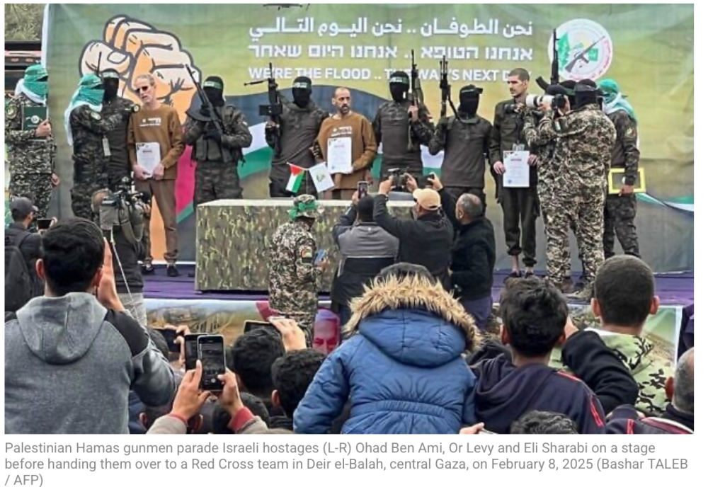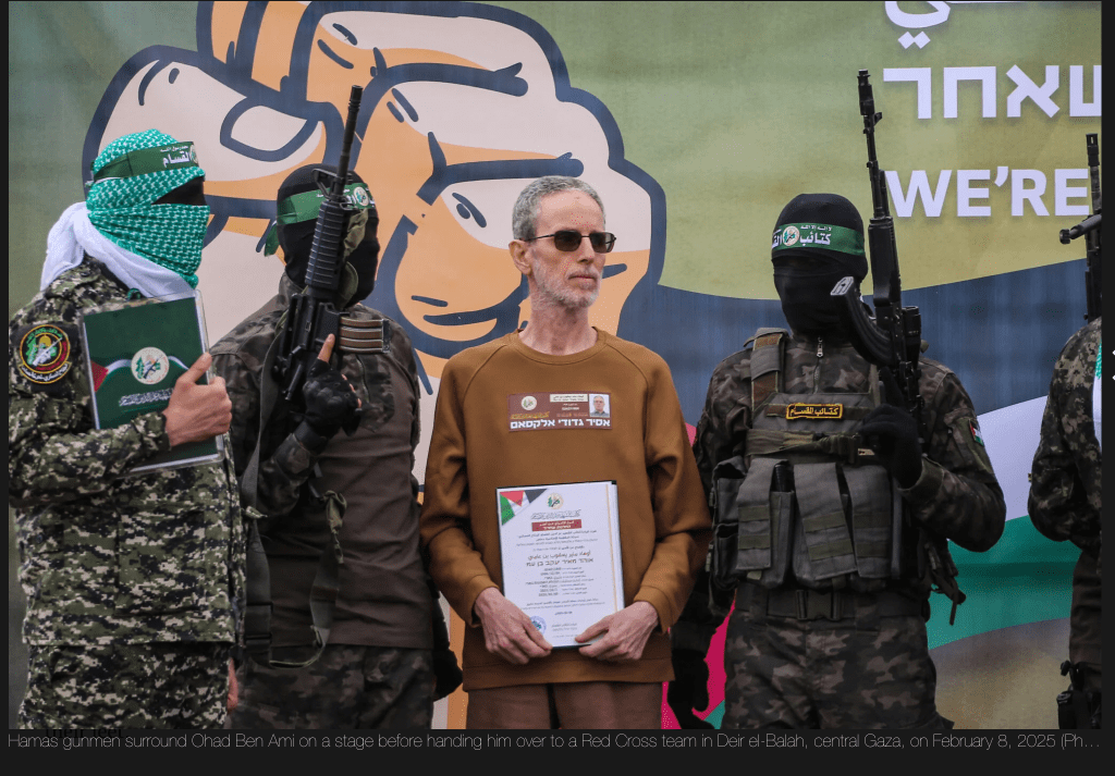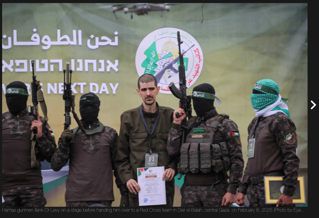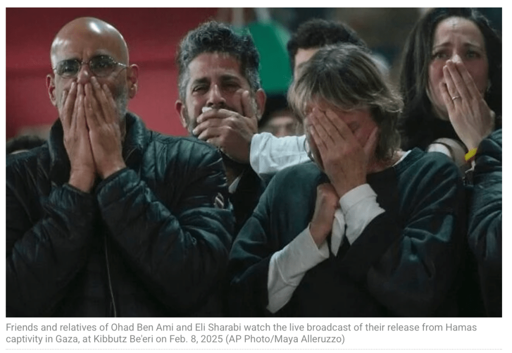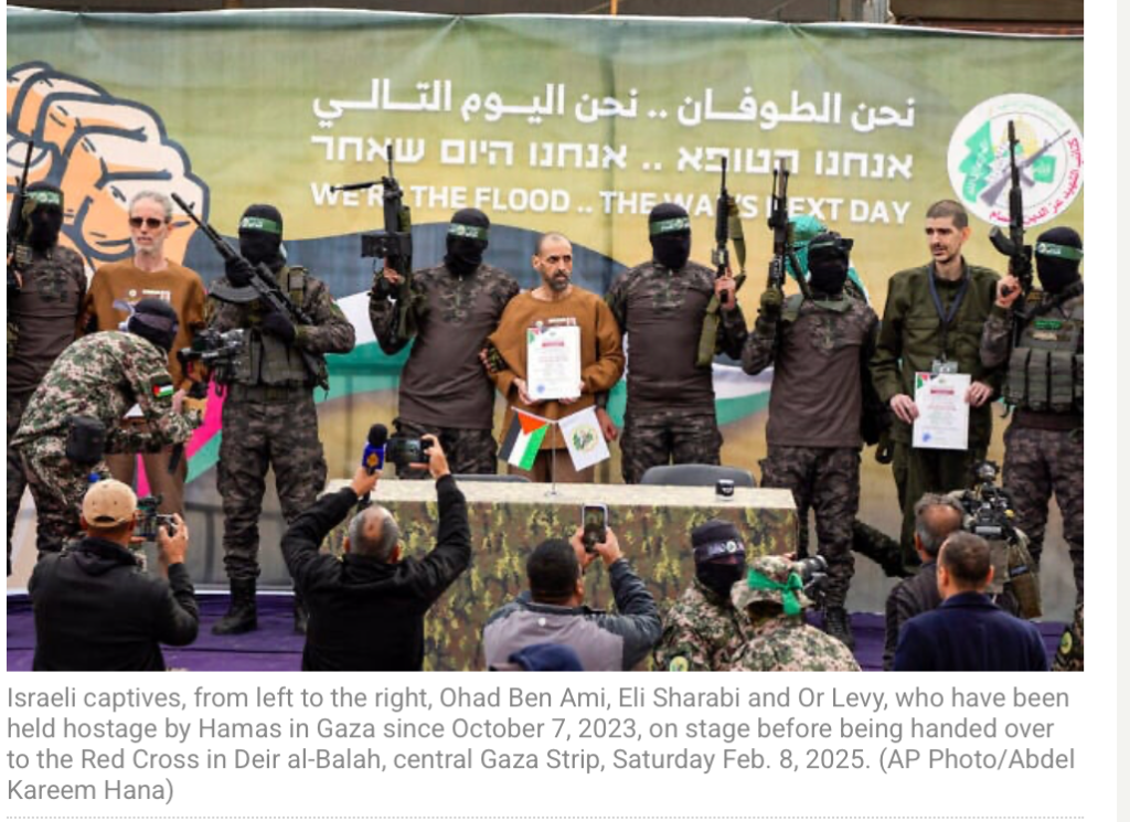 Es waren nicht die lachenden, äusserlich fitten jungen Frauen und auch nicht die erstaunlich gut aussehenden ersten männlichen Geiseln, die heute freigelassen wurden. Es waren schwer gezeichnete Männer, nur mehr Schatten ihrer selbst, die von den Hamas-Terroristen auf die ‘Bühne’ gezerrt wurden. In das ihnen einzeln vorgehaltene Mikrofon sprachen sie lobende Worte für ihre Peiniger. Es gehe ihnen gut, sie hätten ausreichend Wasser und Nahrung bekommen. Man habe sie vor den Luftangriffen der IAF geschützt und überhaupt sich gut um sie gekümmert. Die israelische Regierung habe versagt. Ein mühsames, orchestriertes Winken und dann durften sie endlich in den Fahrzeugen der IRK ihren Peinigern davonfahren.