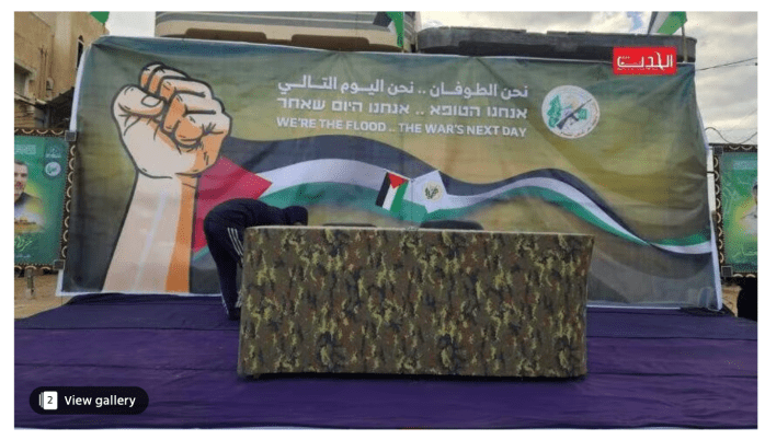 Auf dem Plakat hinter der ‘Bühne’, auf der die ‘Verabschiedungszeremonie’ stattfand, steht eine klare Botschaft an Netanyahu und Trump: ‘Wir sind auch am Tag danach hier’. Also die Feststellung, dass auch nach Kriegsende die palästinensische Terror-Organisation Hamas den Gazastreifen beherrschen wird.