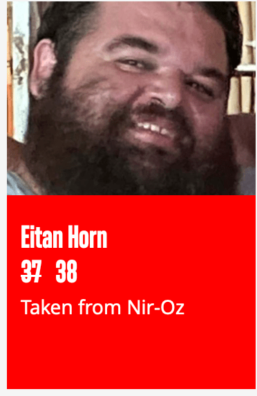 Eli Sharabi, 52, wurde aus seinem Heimat-Kibbutz Be’eri verschleppt, er galt lange als vermisst. Zunächst ebenfalls als vermisst galten seine Frau Lianne und seine Töchter Noiya, 16 und Yahel,13, s’’l. Ihre sterblichen Überreste wurden jedoch eine Woche nach dem Massaker entdeckt und identifiziert. Sein Bruder Yossi wurde für tot erklärt, seine sterblichen Überreste werden von der Hamas in Gaza festgehalten.
