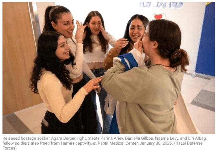 Die jungen Soldatinnen des Aufklärungsstützpunkts Nahal Oz waren während der Geiselhaft meist zusammen. Einmal, so berichteten sie, sassen sie um eine Platte mit Reis. Das war zu einem Zeitpunkt, als sie fast keine Nahrung mehr erhielten. Liri Albag, deren Video noch wenige Wochen vor ihrer Freilassung nicht nur ihre Eltern erschütterte, habe sie immer wieder motiviert. In dieser verzweifelten Situation schlug sie vor, die Reiskörner ringsum zu verteilen, damit jede von ihnen genau die gleiche Menge erhielt. Gleichzeitig mussten sie sich vorstellen, in einem Restaurant zu sitzen und der Reis sei genau das, was sie bestellt hätten. «So ein Hunger, wie der, den wir hatten, kann nicht erklärt werden», betonte eine der jungen Frauen. Trotz der schlechten Ernährung beschlossen sie gemeinsam, ihre jüdische Identität zu beachten. Dazu gehörte auch, dass sie während der Pessach Woche kein gesäuertes Brot assen und an Yom Kippur fasteten. Agam Berger, die erst Tage nach den anderen vier Soldatinnen freigelassen wurde, hielt sich sogar strikt an die Vorschriften für Shabbat. Ihre Mutter hatte darum gebeten, davon abzusehen, am Shabbat Bilder von ihr zu machen.
